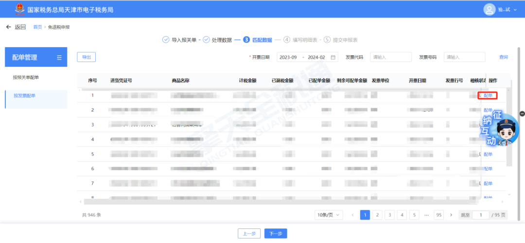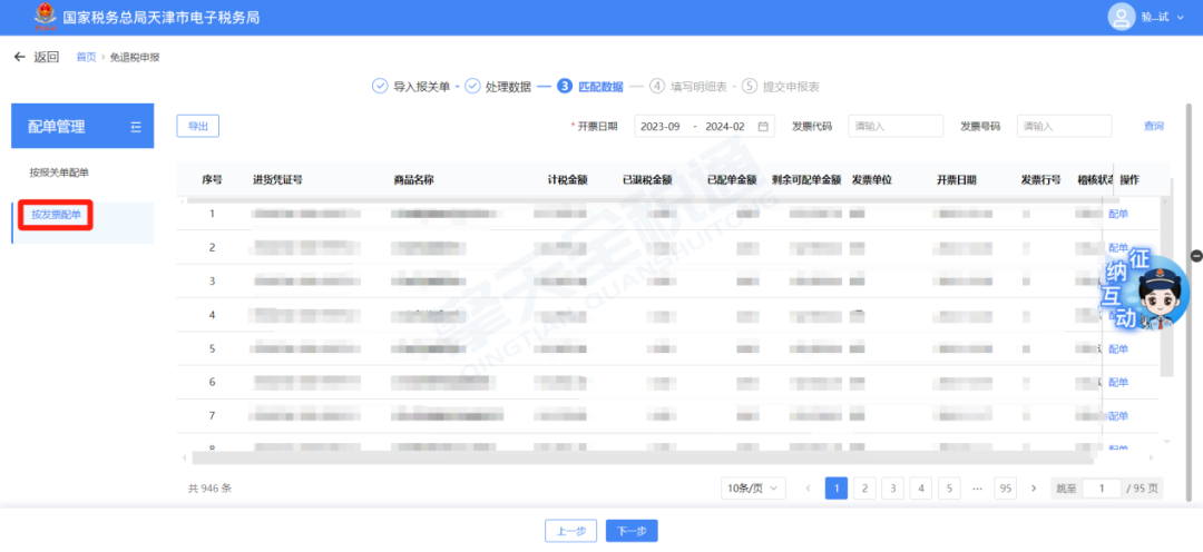 2.进入“匹配数据”界面后选择“按发票配单”,界面展示当前纳税人的发票数据。
