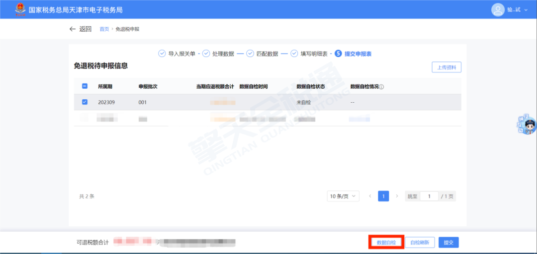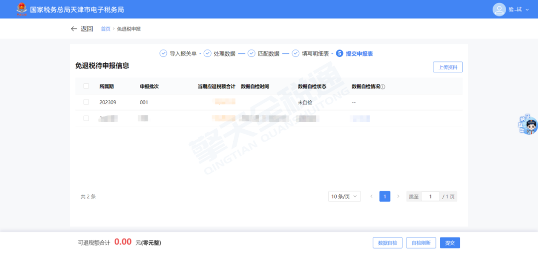 1.“提交申报表”界面中,展示“填写明细表”中的数据,可将列表中的数据进行“上传资料”、“数据自检”和“提交”等操作。