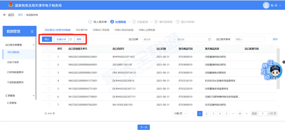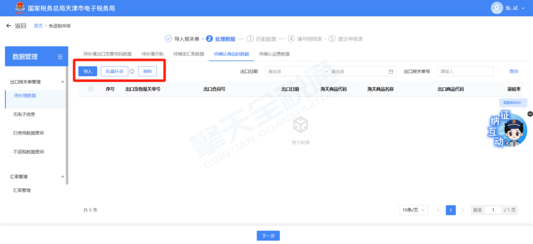 (1)出口报关单管理—待处理数据中,系统自动将纳税人导入的出口报关单数据进行分类,分为“待补填出口发票号数据”、“待确认汇率数据”、“待确认商品码数据”和“待确认运费数据”。