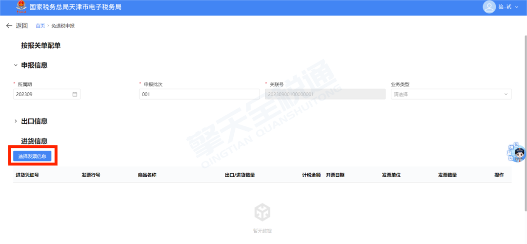 (2)“按报关单配单”界面,录入需要生成的“所属期”和“批次”,点击【选择发票信息】按钮,弹出“选择发票信息”窗口。