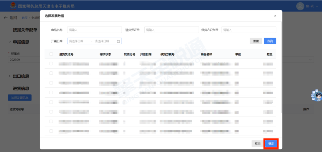 (3)“选择发票信息”窗口中,输入查询条件,勾选对应的增值税专用发票,点击【确定】 按钮,完成配单。