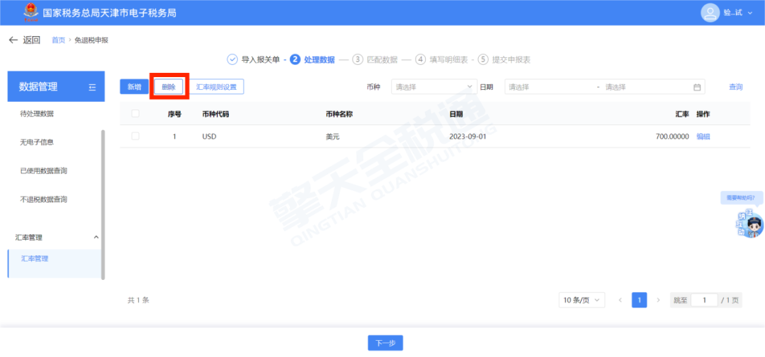 (5)选择报关单数据后,可在当前报关单数据后方点击【删除】 按钮,删除此行报关单数据。