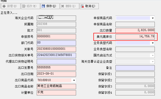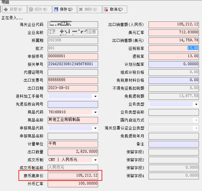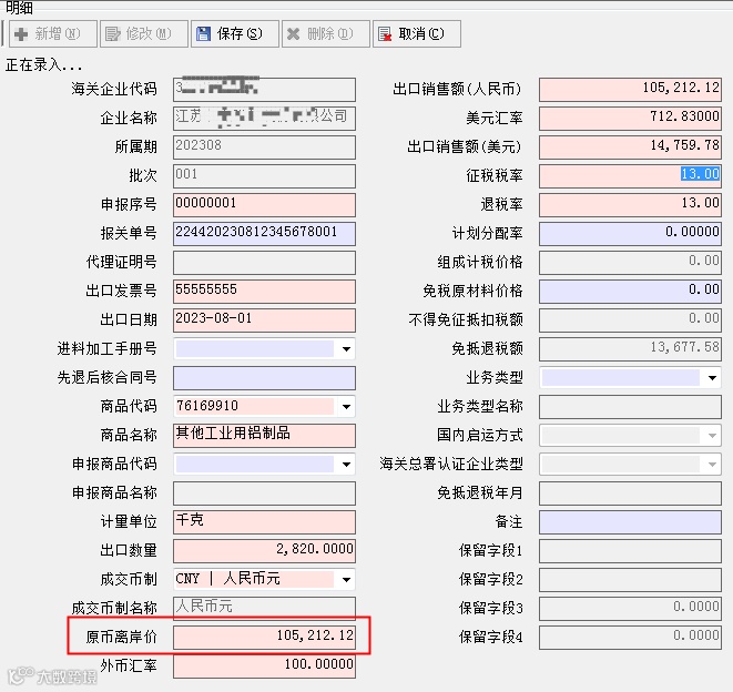 【基础数据采集】—【退税数据采集】—【出口明细录入】,“美元离岸价”栏次填写扣减过运保费的美元FOB价(若报关单上不是以美元成交,此栏次也须折算为美金填写,折算规则为外币折人民币再折美金)。