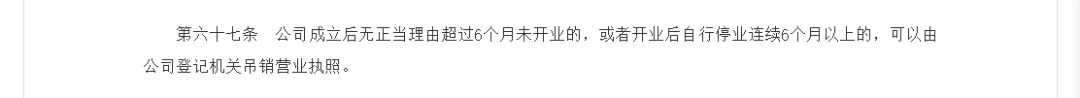 《中华人民共和国公司登记管理条例》明文规定:“公司成立后无正当理由超过六个月未开业的,或者开业后自行停业连续六个月以上的,可以由公司登记机关吊销营业执照。”
