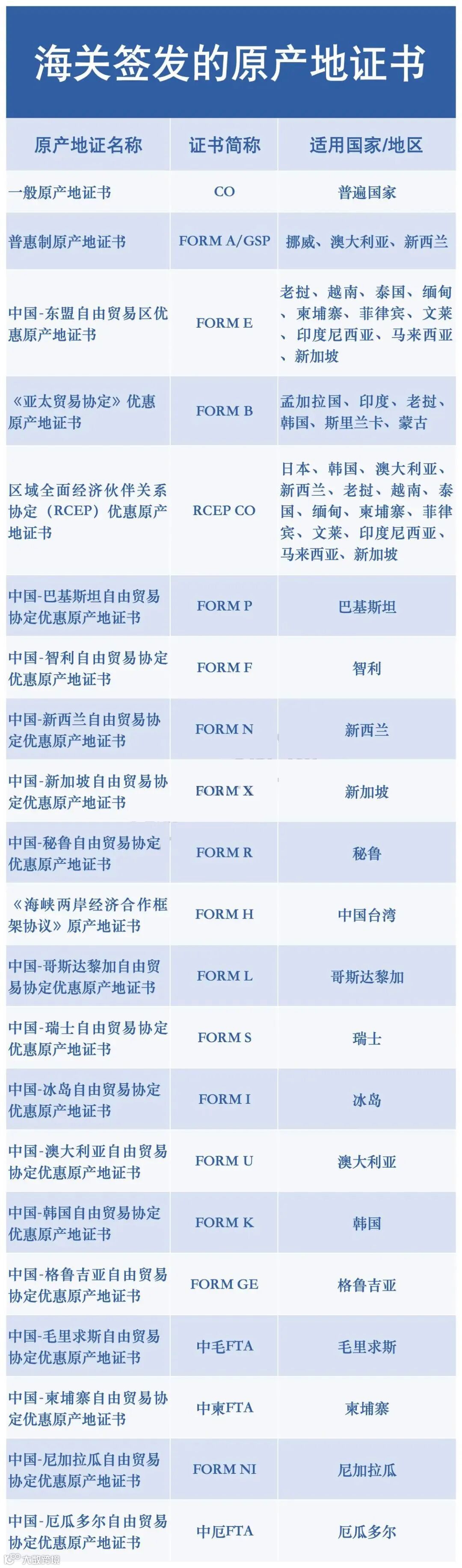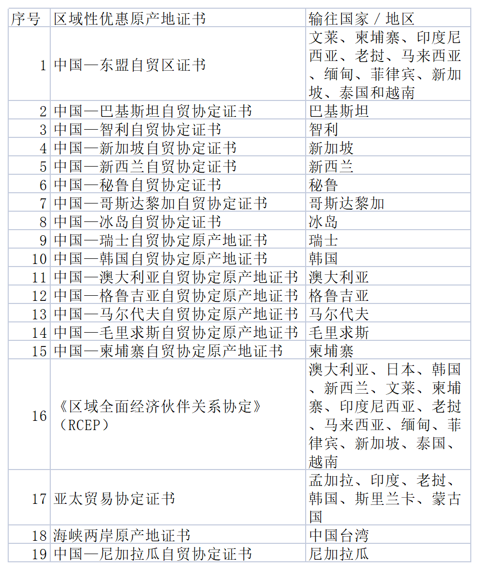 我国目前已与26个国家或地区签署19个自贸协定或优惠贸易安排。那我国可签发的原产地证书有哪些?