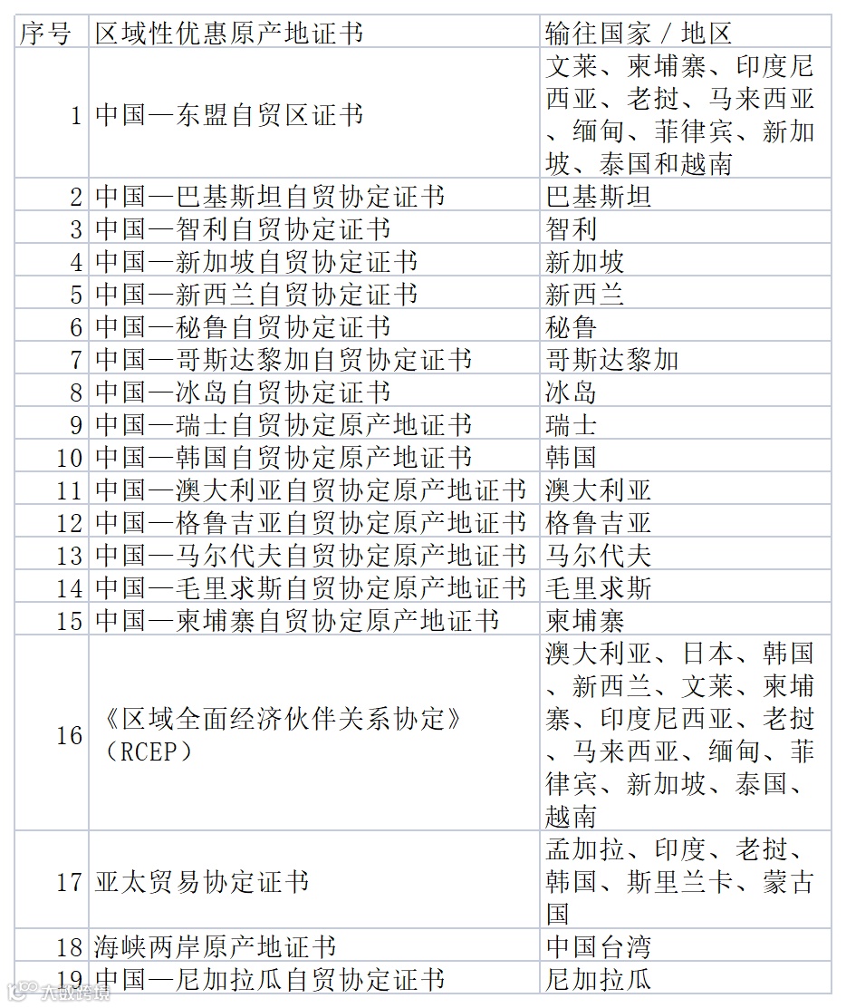 ③区域性优惠原产地证书:即FTA证书,是两个或更多的经济体之间签署协定,在WTO最惠国待遇基础上进一步消除货物贸易的关税和非关税壁垒,改善服务贸易、投资的市场准入条件,实现贸易投资自由化与经济融合,共有19种。