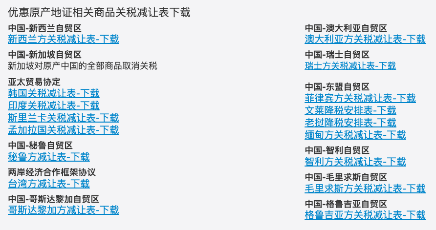 企业也可通过登录“中国自由贸易区服务网”(http://fta.mofcom.gov.cn/)—“已签协议的自贸区”—“中国—减免国家”—“附件”查看出口商品是否落入优惠范围。