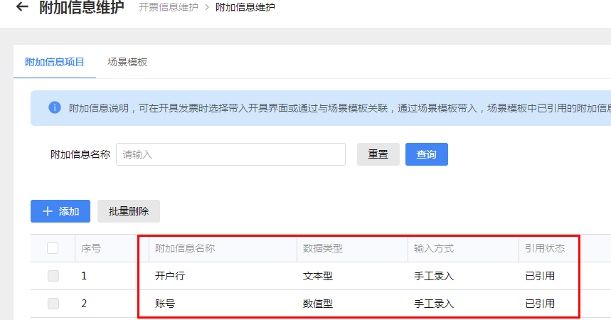 ③在附加信息项目里面增加两个附加信息,一个开户行(文本型),一个账号(数值型)。