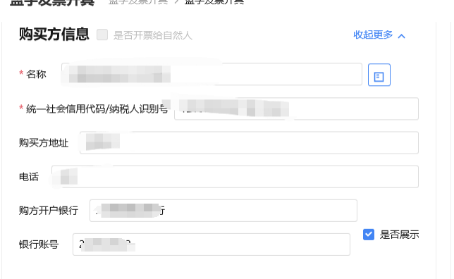 (1)填写【购买方信息】:开具增值税专用发票的,【名称】和【统一社会信用代码/纳税人识别号】为必填项;开具普通发票的,仅【名称】为必填项。