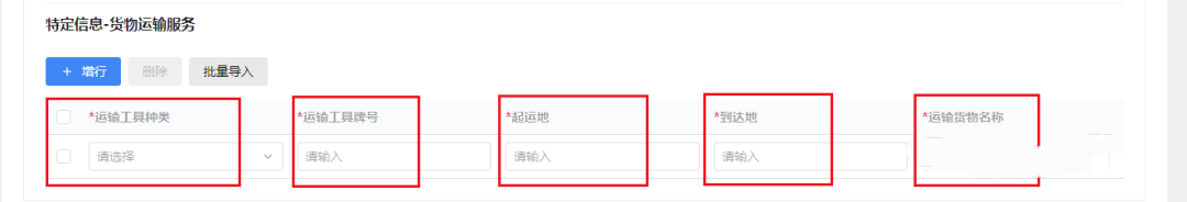 (3)填写【特定信息】:货物运输服务的特定信息,需要填报【运输工具种类】【运输工具牌号】【起运地】【到达地】【运输货物名称】。