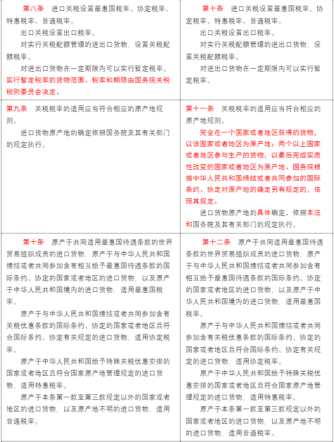 2、在关税征收方面,由于各国普遍采用多种税率,进口国必须首先确定进口商品的原产地,以便对来自不同国家或地区的商品给予不同的关税待遇。因此,《关税法》增加了原产地规则判定的具体描述。(第十一条)