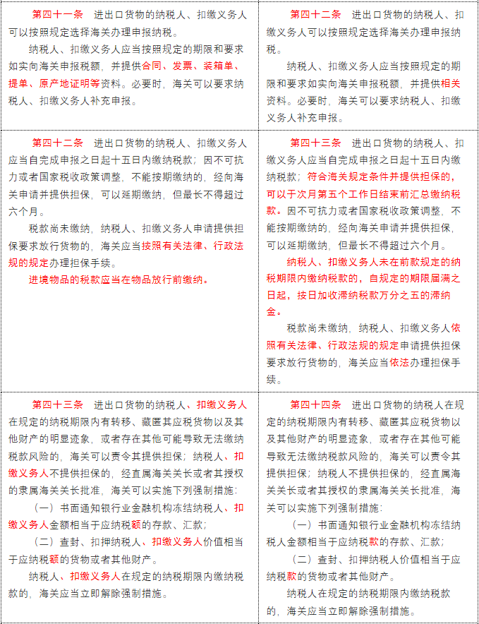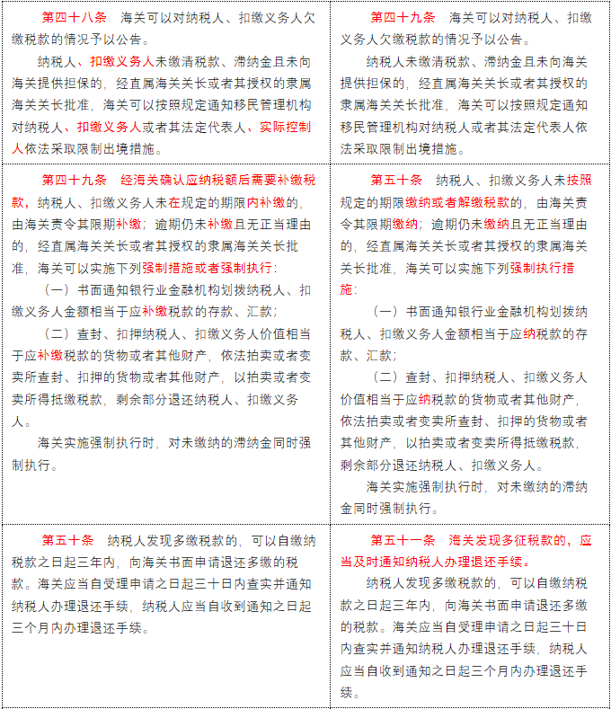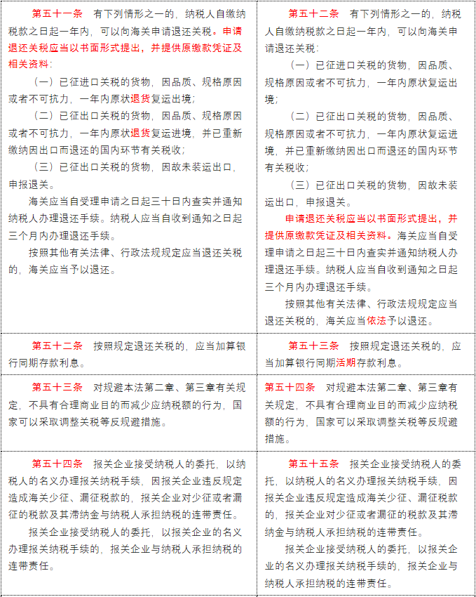 退税:纳税人发现多缴税款的,可以自缴纳税款之日起三年内(原来为1年),向海关书面申请退还多缴的税款。这是对进出口纳税人的实质性利好。(第五十一条)