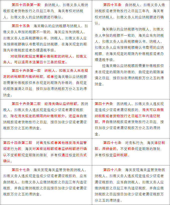 征税:自纳税人、扣缴义务人缴纳税款或者货物放行之日起三年内,海关有权对纳税人、扣缴义务人的应纳税额进行确认。海关确认的应纳税额与纳税人、扣缴义务人申报的税额不一致的,海关应当向纳税人、扣缴义务人出具税额确认书。(第四十五条)