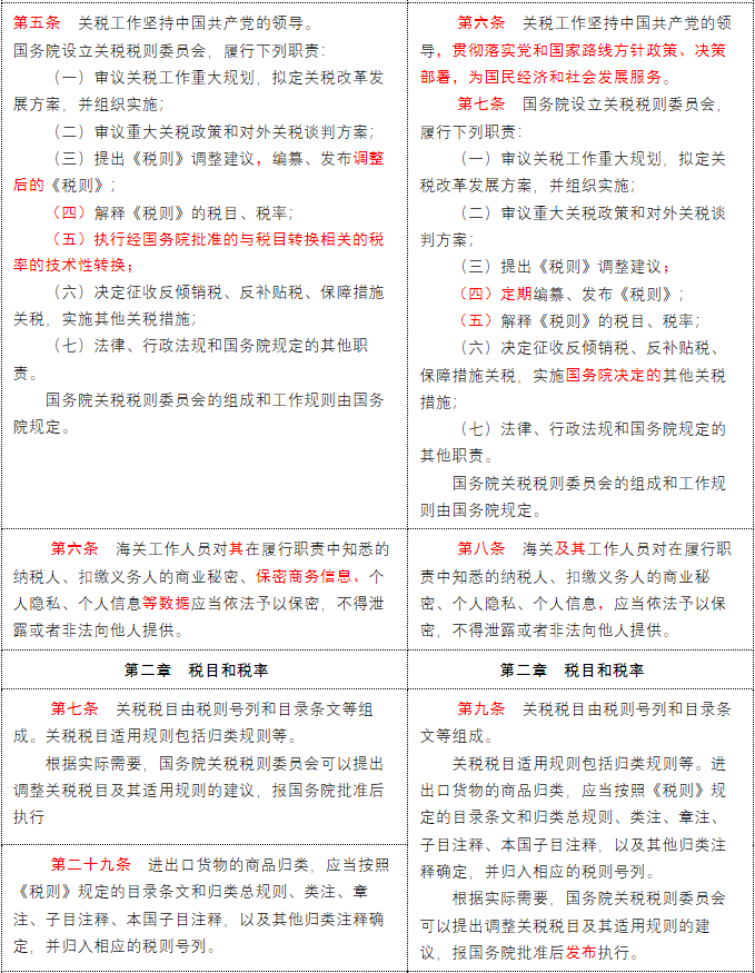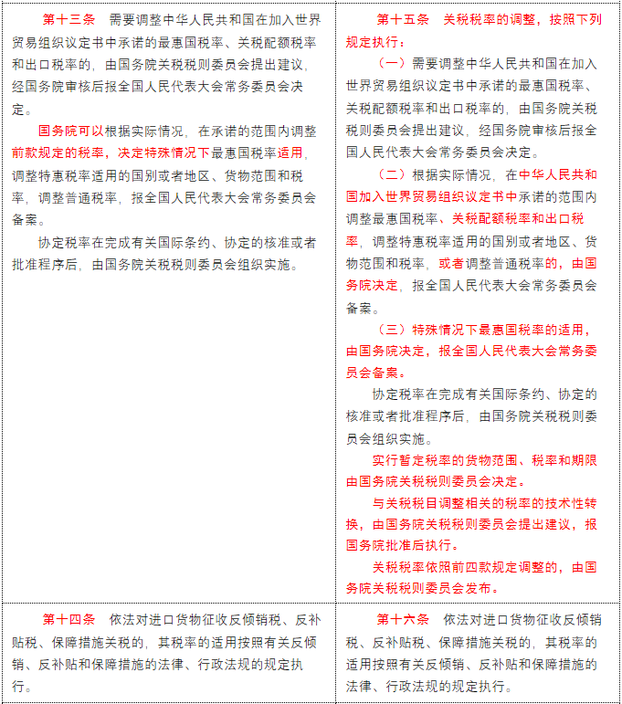 1、《关税法》规范了关税税目税率的设置、调整和实施,明确了作为附件的《税则》是《关税法》的组成部分。进出口货物的关税税目、税率以及税目、税率的适用规则等,依照本法所附《中华人民共和国进出口税则》执行(第四条);明确规定了各类关税税率的适用规则和调整机制;同时,授权国务院关税税则委员会可以提出调整关税税目及其适用规则的建议,报国务院批准后发布执行。(第九条)