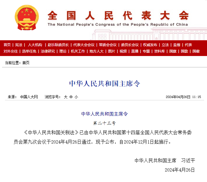 4月26日,十四届全国人大常委会第九次会议表决通过了《中华人民共和国关税法》(以下简称《关税法》),自2024年12月1日起施行。随着关税法制定出台,我国现行18个税种中已有13个税种制定了法律。