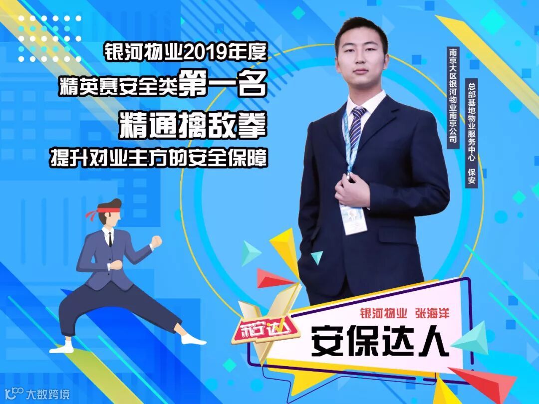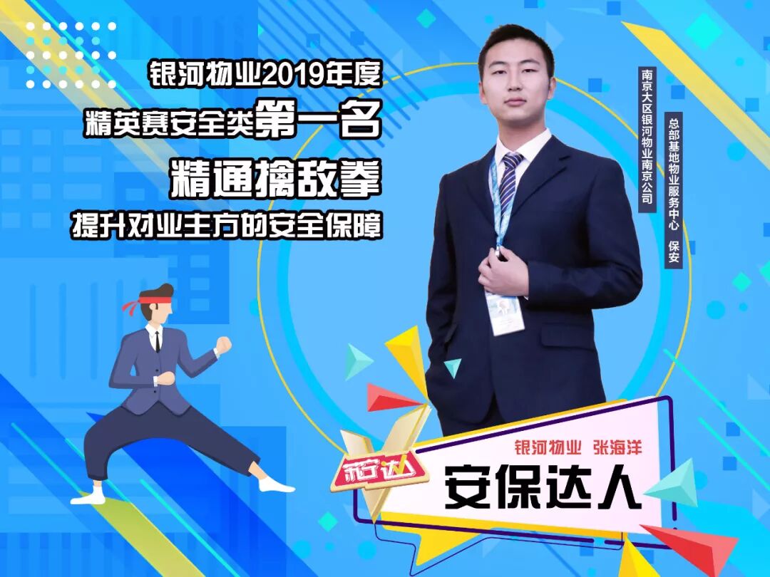 南京大区银河物业的保安。他有一套擒敌拳,为保安工作保驾护航,大大提升对业主方的安全保障;银河物业2019年度精英赛安全类第一名。