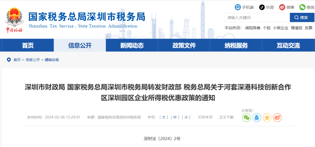 2月6日,深圳市税务局转发财政部、税务总局文件,发布河套深港科技创新合作区深圳园区企业所得税优惠政策的通知。