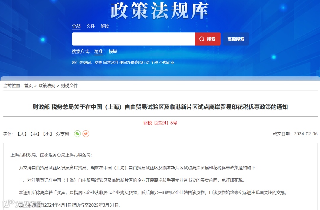 为支持自由贸易试验区发展离岸贸易,现就在中国(上海)自由贸易试验区及临港新片区试点离岸贸易印花税优惠政策通知如下: