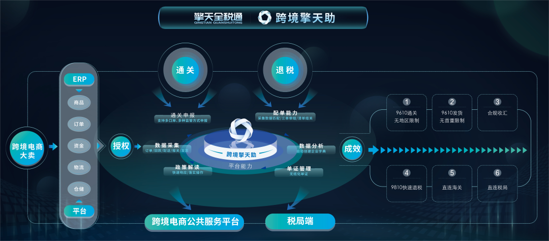 近年来,擎天全税通积极探索跨境电商阳光出海新模式,充分展现其在“9610”、“9810”报关模式下跨境通关退税的创新优势,基于数字化技术帮助跨境商家实现业务精准“投篮”,智能连通订舱、发票、入仓、销售、放款、收汇等业务数据,清晰溯源跨境出海全链路,实现退税关单与商品数据信息快速匹配,线上完成退税预申报与正式申报工作,实现“一键通关+退税”,增强企业出海竞争力。