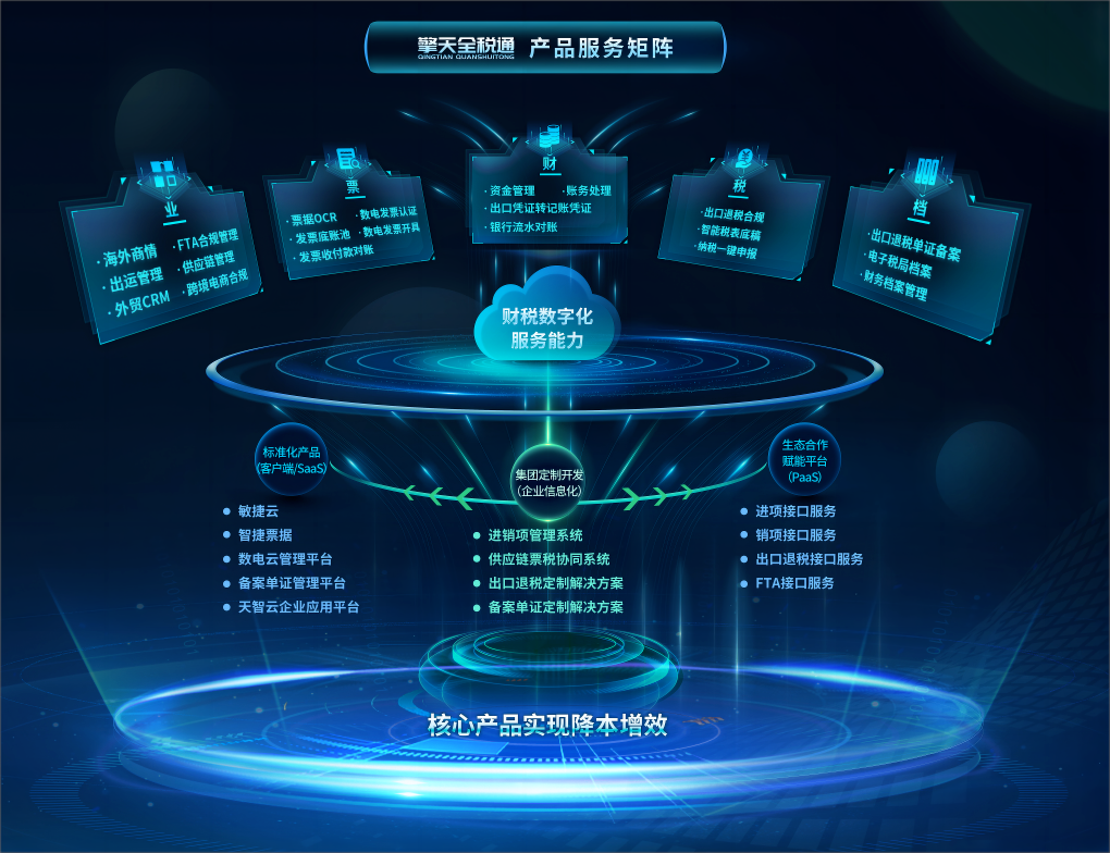 作为国内财税SaaS服务细分领域的龙头企业,擎天全税通基于在财税领域长期的积累与客户洞察,在税控发票、纳税申报、出口退税、大数据应用等领域,实现“业-票-财-税-档”业务场景深度融合,核心产品智能退税软件市场占有率遥遥领先,多项产品斩获国家级殊荣。