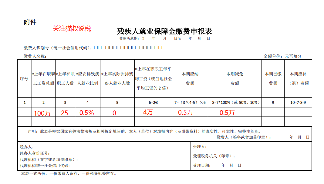 案例一:XX公司2022年工资总额100万,职工人数25人,未安排残疾人,如何申报残疾人就业保障金?