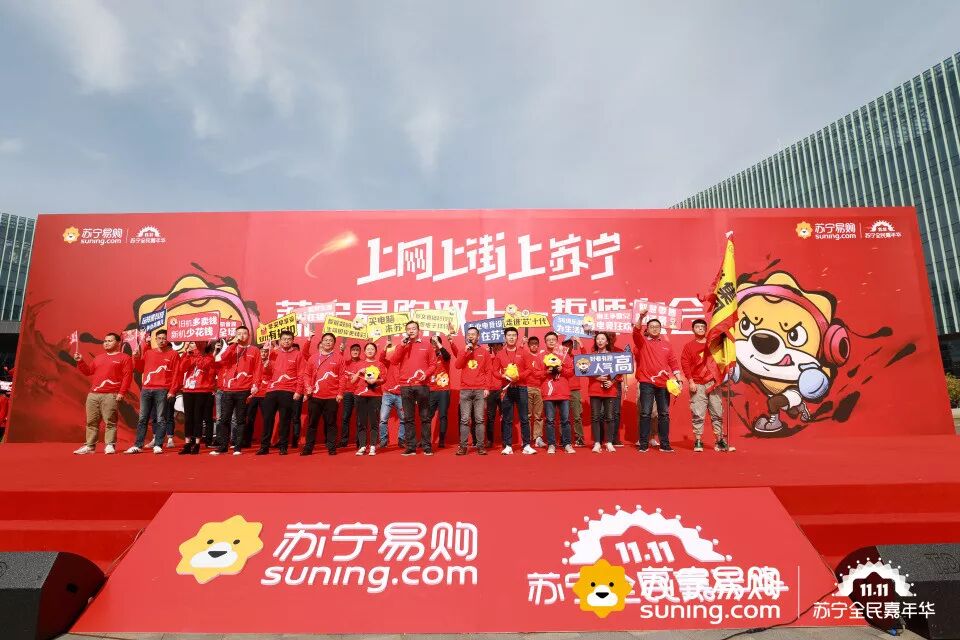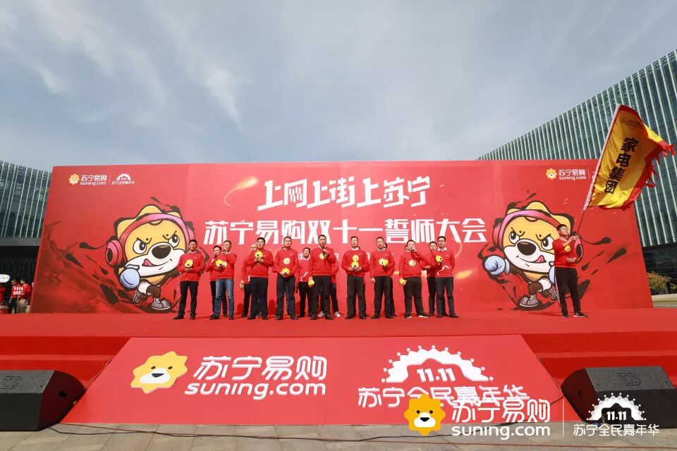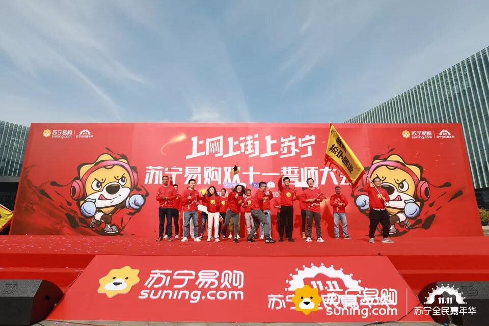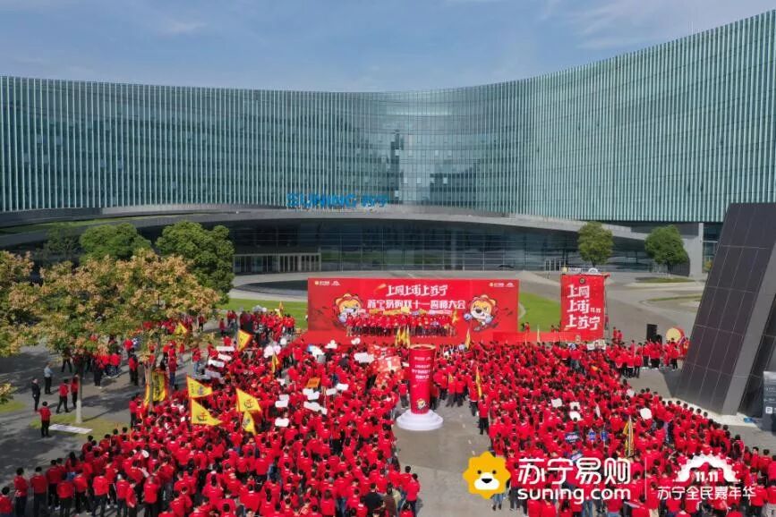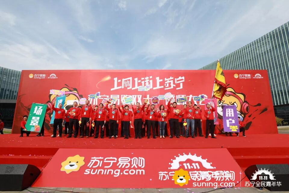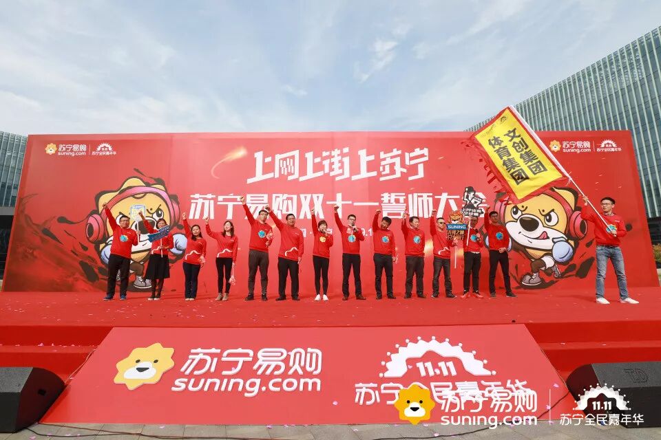 战略布局已成型,紧接而来的就是要调兵遣将、各路大军纷纷出击。10月28日,在双十一发布会召开一周后,集团就在南京总部举行“双十一全民嘉年华”誓师大会:活动现场,战鼓擂起,声声震天,“场景零售”军团全体出击,来自零售、置业、金融、物流、科技、体育、文创等集团旗下各产业体系的战狮们齐聚一堂,气氛既紧张又活泼,人人热血沸腾、激情澎湃,展露出“双十一必胜”的决心。