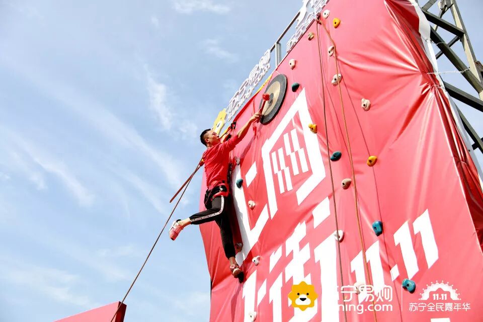 在誓师大会上,特别设置了“攀岩夺旗帜”环节。只见各个产业的“夺旗手”奋力向上攀登,勇夺最高处的旗帜,然后随同护旗手将旗帜交到自己所在产业的总裁们手中。此举看似只是游戏,但寓意着集团“执著拼搏、永不言败”的企业精神。看到自己的同事手脚麻利地夺得了旗帜,现场员工幽默的说道:“没想到我们苏宁人不仅工作干得棒,身体也挺扎实的,看这架势,今年双11任务肯定能超额完成!”