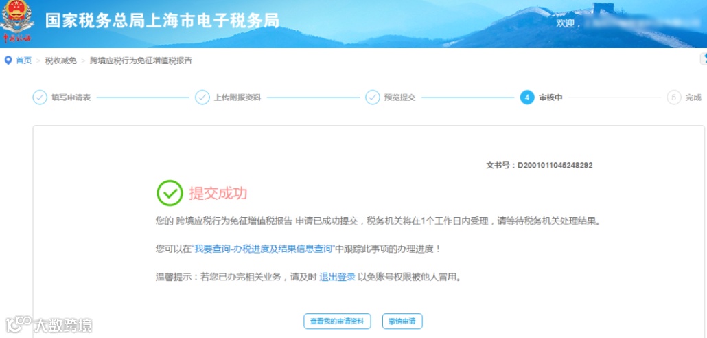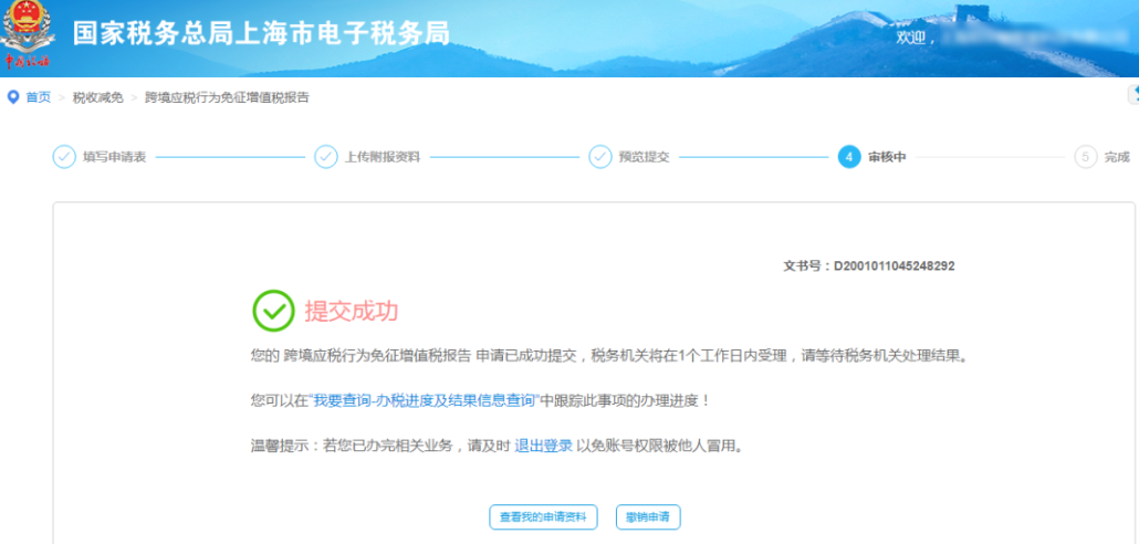 待税务机关确认办结后,可下载打印 《税务事项通知书》。税务机关办理意见为同意的,可打印《跨境应税行为免征备案表》。