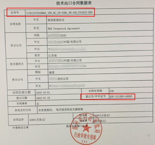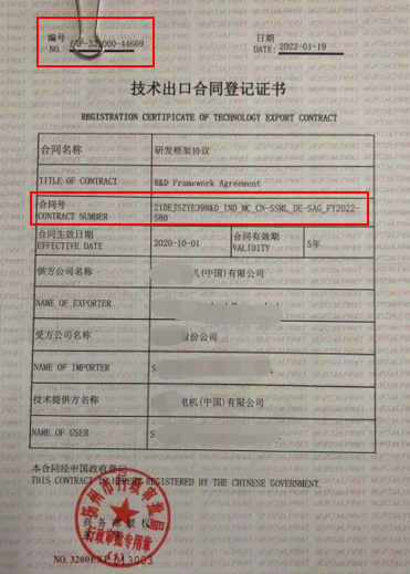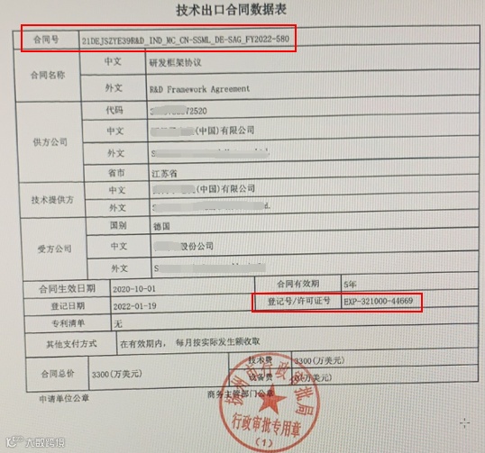 取得在商务部登记的《技术出口合同登记证》及其数据表(如下图所示),取得收汇凭证,开具出口发票: