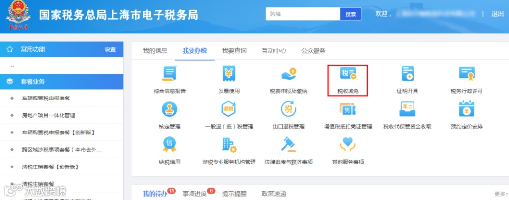 登录电子税务局,【我要办税】—【税收减免】—【跨境应税行为免征增值税报告】,点击进入办理页面。