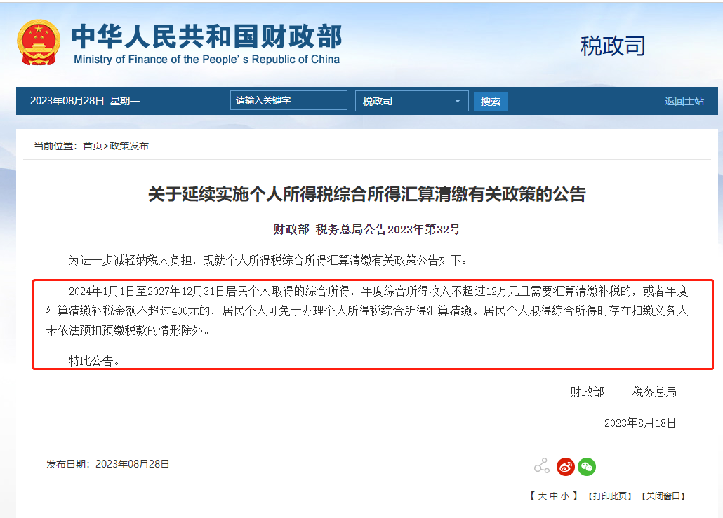 对年度综合所得收入不超过12万元且需要汇算清缴补税的,或者年度汇算清缴补税金额不超过400元的居民个人,可免予办理个人所得税综合所得汇算清缴;