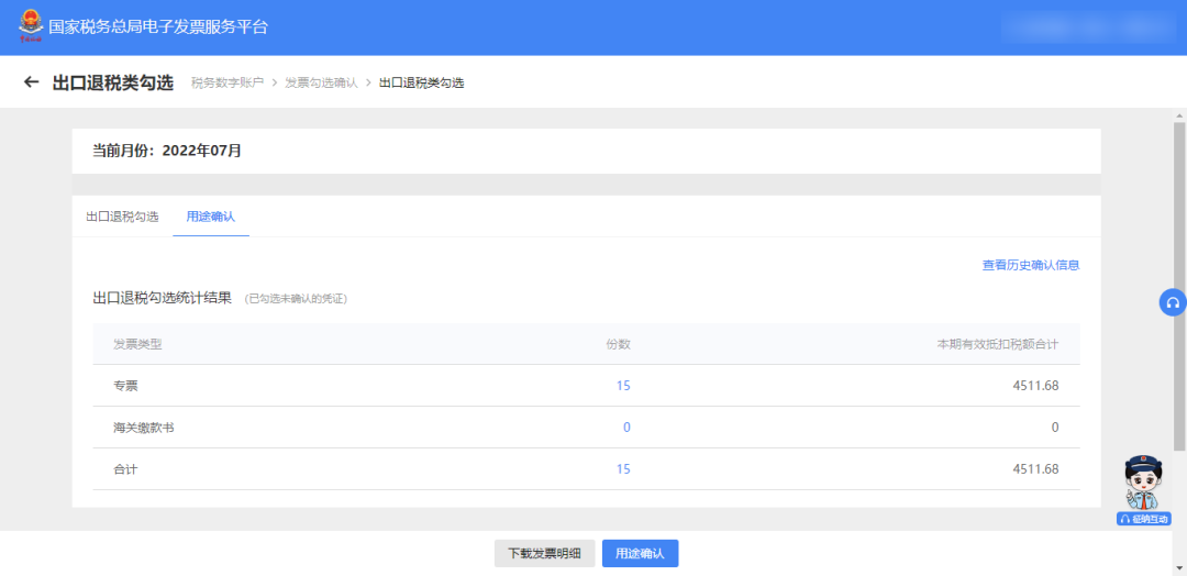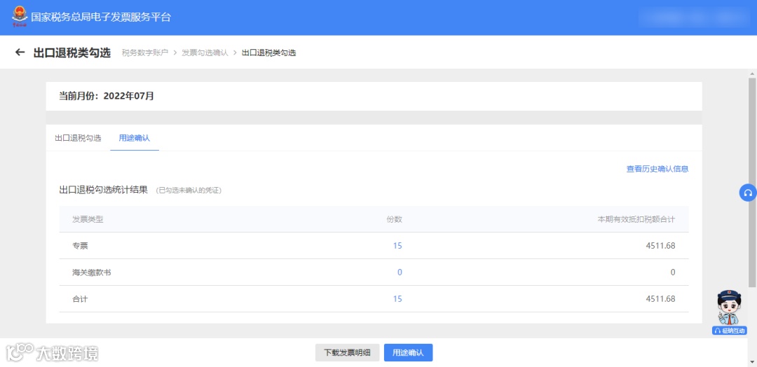 选择【税务数字账户】-【发票勾选确认】-【出口退税类勾选】-【用途确认】。
