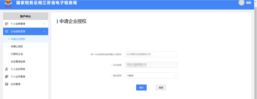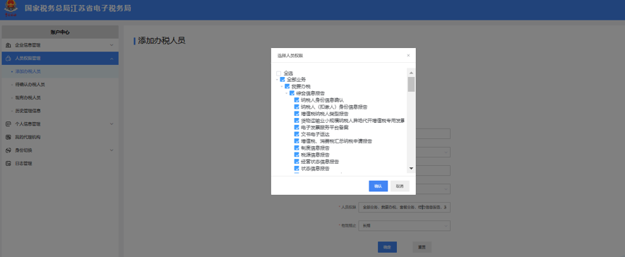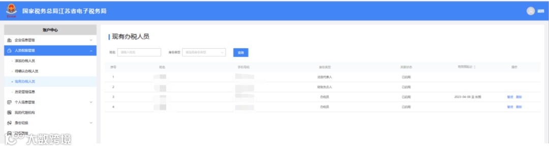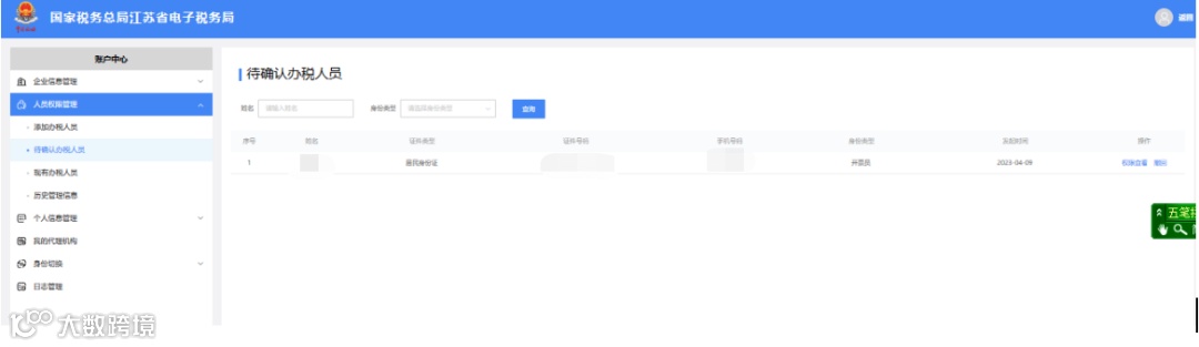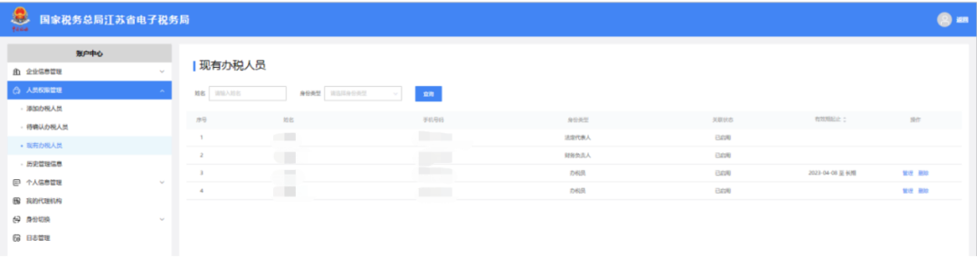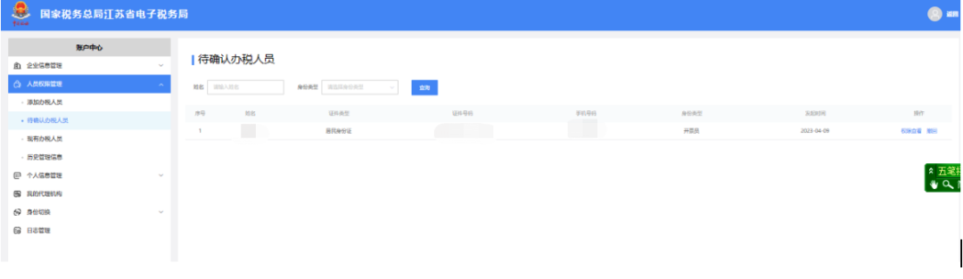 第六步:办税人以自然人身份登录江苏省电子税务局,在“人员权限管理-待确认办税人员”功能菜单中进行授权确认。确认后,企业在“现有办税人员”列表中展示新增加的办税人信息。如下图所示: