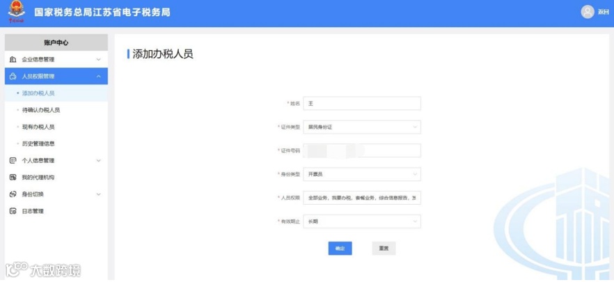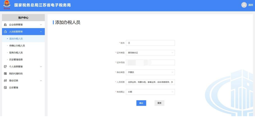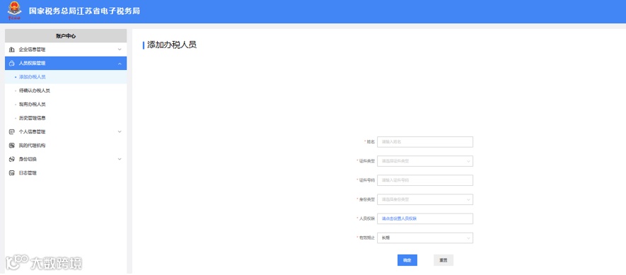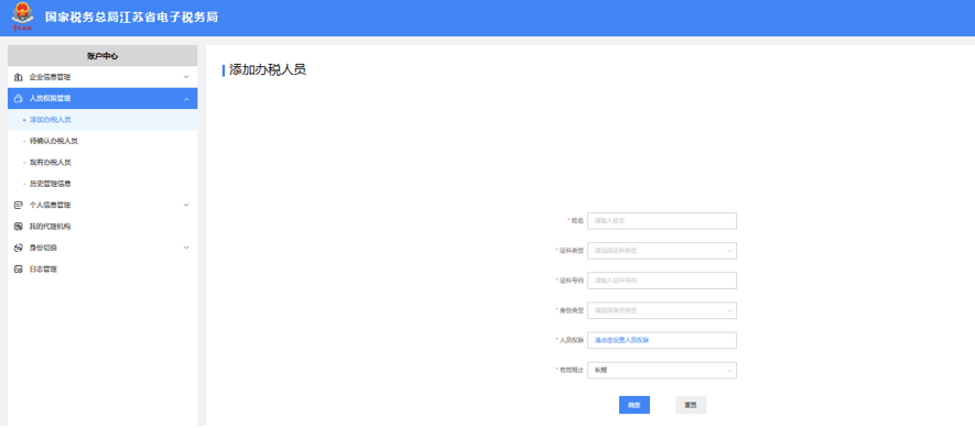 第一步:登录电子税务局,进入账户中心,点击菜单栏“人员权限管理”-“添加办税人员”进入添加办税人员信息界面。如下图所示: