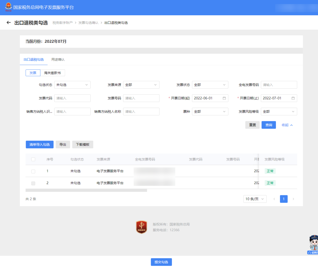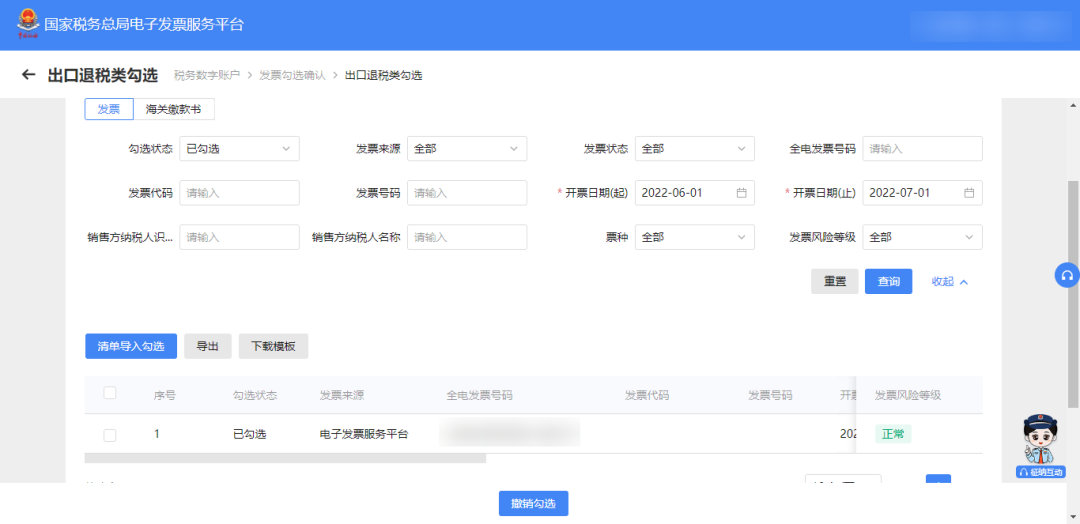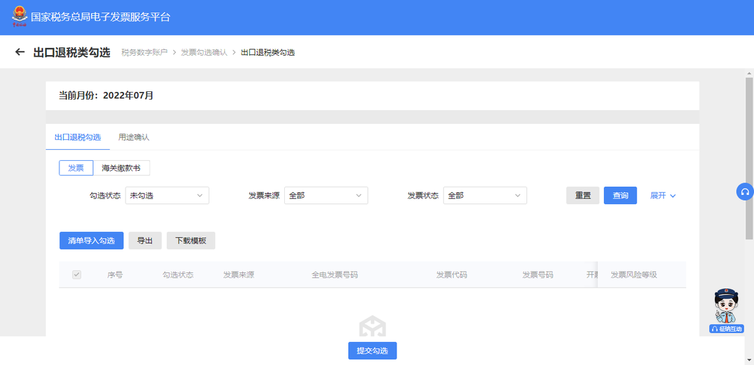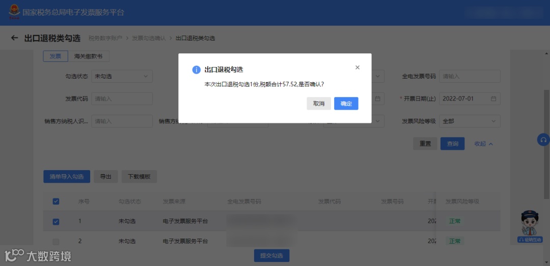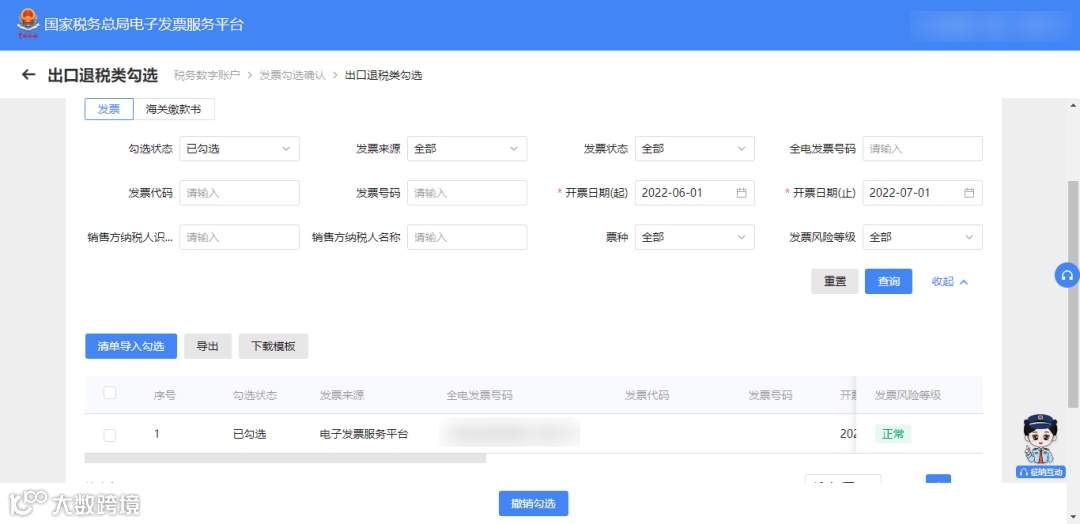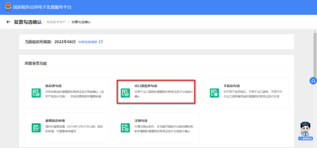 选择【税务数字账户】-【发票勾选确认】-【出口退税类勾选】