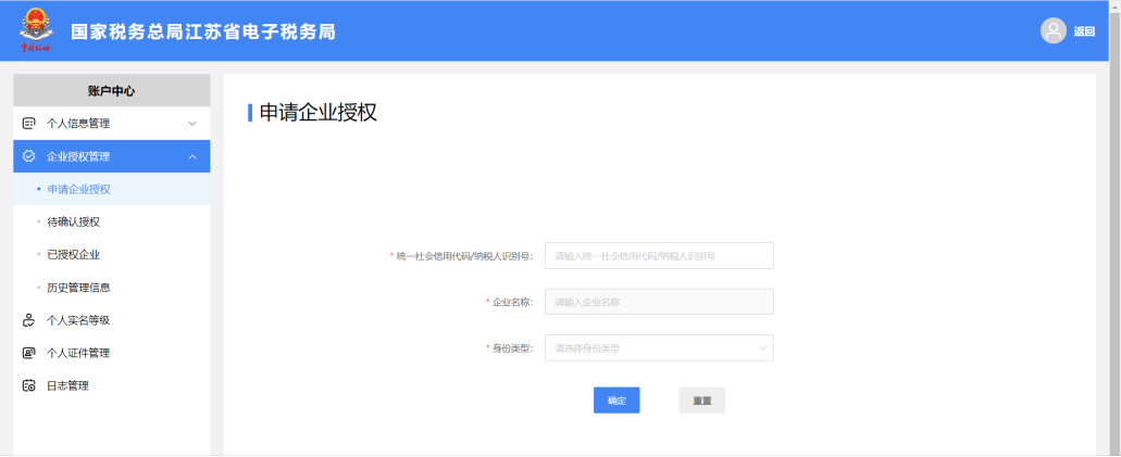 第一步:选择“自然人业务”登录,点击菜单栏“企业授权管理”-“申请企业授权”。如下图所示: