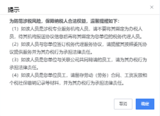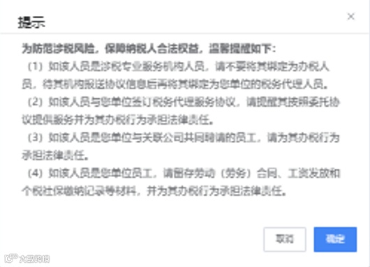 第四步:信息确认无误后,点击【确定】按钮提交,系统进行涉税风险确认提示,如下图所示: