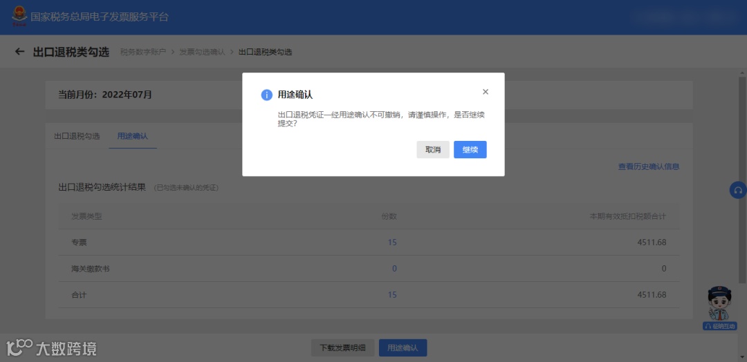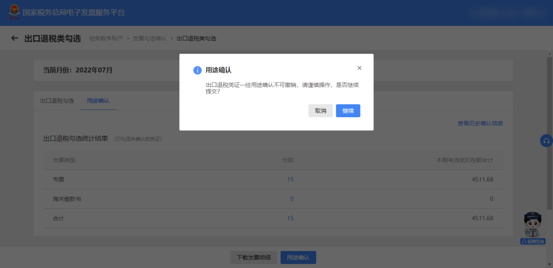 核对统计数据无误后,点击【用途确认】按钮,出现弹窗提示。