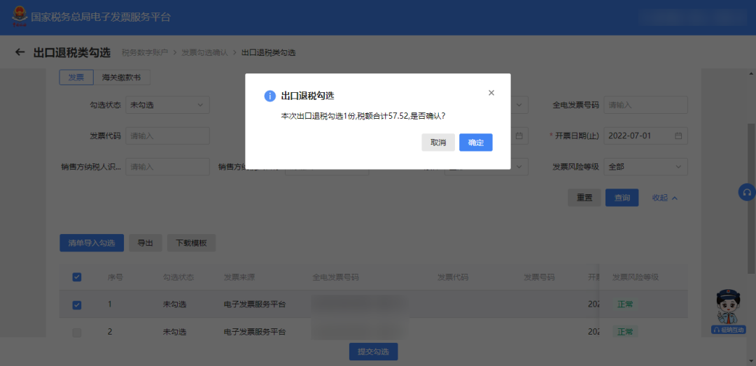 选中需要勾选的发票,点击“提交勾选”按钮,进行提示确认(如“本次出口退税勾选XX份,税额合计XX,是否确认?”)。确认无误后点击“确定”按钮,关闭窗口后提示提交成功。