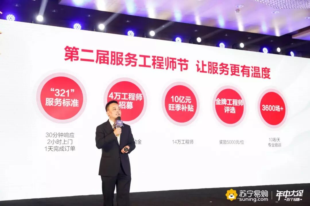 好服务,成苏宁618重头戏。侯恩龙介绍,目前,苏宁在全国有10万名服务工程师,今年会再扩招4万精兵,为消费者提供无忧的高质量售后服务,严格按照30分钟响应、2小时内准时上门、1天内完成订单的“321”服务标准,对乱收费等行业乱象说不,击碎行业潜规则。此外,成功推荐服务工程师,可获得推荐奖励金。