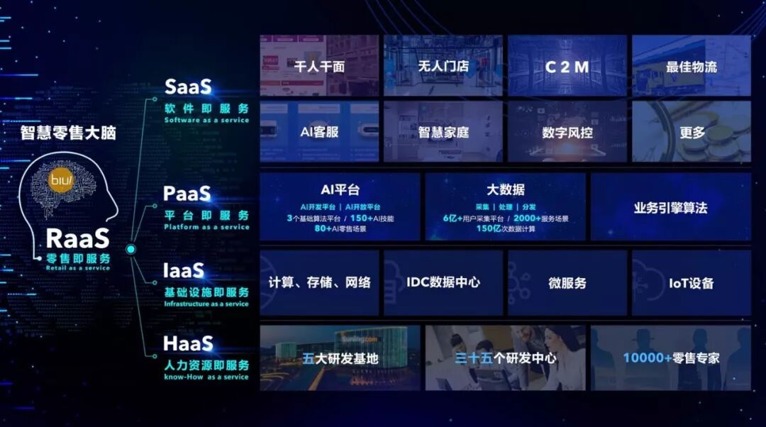 近年来,苏宁在通过智慧零售实现自身转型发展的同时,也不断将智慧零售的资源和能力全方位对外输出,助力更多中国品牌尤其是中小品牌的发展升级。作为苏宁29年零售经验与技术成果的沉淀,智慧零售大脑(RaaS,即Retail -as-a-Service)形成了完善的智慧零售数字化解决方案,通过物流云、数据云和金融云“三云”平台向合作伙伴共享资源,助力更多企业品牌价值的提升。