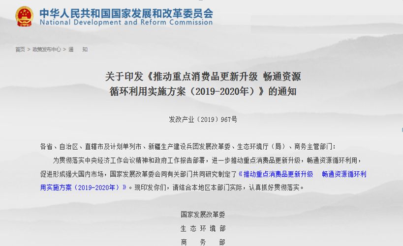 日前,国家发展改革委、生态环境部、商务部三部委发布《推动重点消费品更新升级畅通资源循环利用实施方案(2019-2020年)》。《方案》重点聚焦汽车、家电、消费电子产品领域,进一步巩固产业升级势头,增强市场消费活力,提升消费支撑能力,畅通资源循环利用,促进形成强大国内市场,实现产业高质量发展。