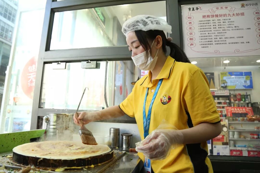 为了便利附近的上班族客户群,“娘子军”开发了系列技能,摊煎饼便是其中一项。经过公司的专业培训后,张敏便开始“边学边实操”。“最难的是摊面饼,特别容易破。遇上客人多了,就更加手忙脚乱。”