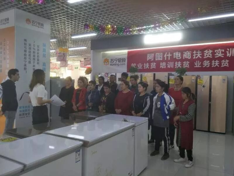 在扶贫中,扶贫实训店吸纳建档立卡的贫困户,对他们进行培训,了解各种家电的功能卖点、学习销售技巧、了解互联网时代下的农村电商运营和苏宁农村电商运作模式等。扶贫实训学员在工作中找到了价值,同时,他们每个月可以获得苏宁发放的1600元的工资以及门店发放的经营提成。现在,当地维族群众提及苏宁扶贫实训店就纷纷竖起大拇指,他们深切感受到实训店对于当地创收脱贫的作用。