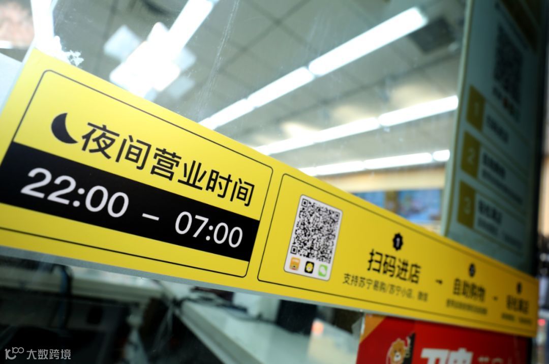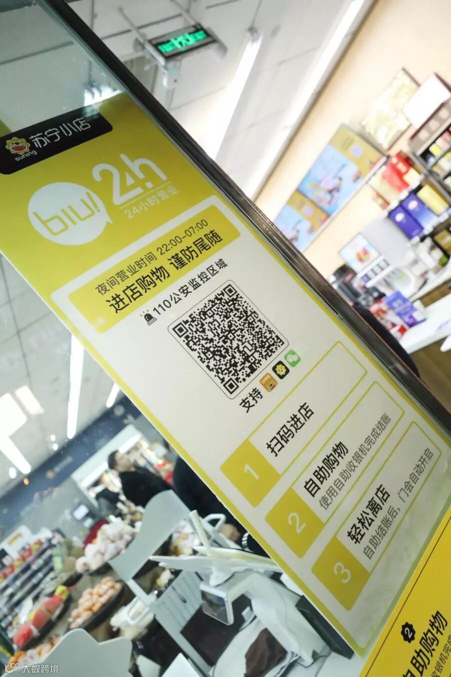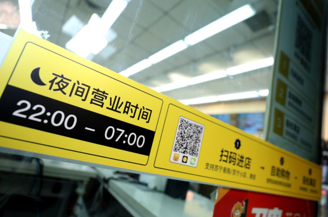 营业时间段为晚间22:00至早上7:00,期间店铺内并无店员值班,顾客可在门口扫码进店,进行自助式的购物后结账,同时也可正常在店内饮食、休息。同时苏宁小店Biu×24h店还配有实时在线客服帮助顾客解决购物操作上的问题与突发状况。