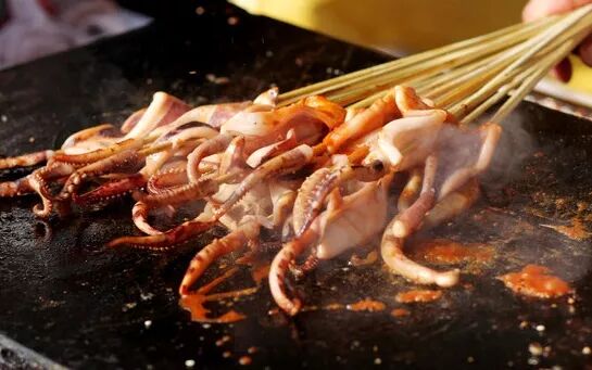 铁板鱿鱼、烤雪梨、烤红薯、烤玉米、棉花糖