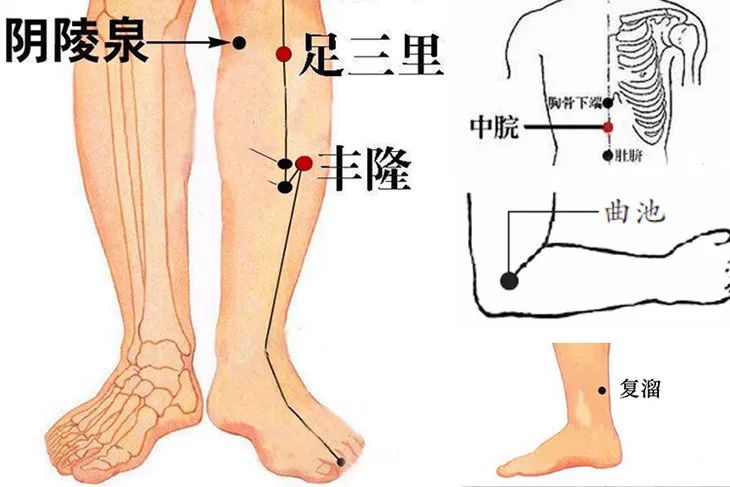 丰隆穴:外膝眼和外踝尖连线的中点。 阴陵泉:顺着小腿内侧往膝关节方向摸,膝窝下凹陷处。 中脘穴:胸骨下端与肚脐连线中点。 足三里:小腿前外侧,外膝眼下四横指。 复溜穴:小腿内踝和跟腱之间向上3指宽的地方。 曲池穴:弯曲胳膊肘时,肘横纹末端的凹陷处。