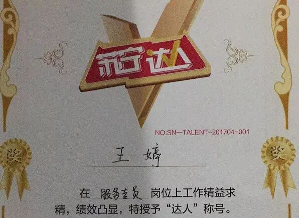 2017年度,评选上“苏宁达人”称号,我认为门店服务专员作为一线的服务操作员、监督员、指导员,其工作结果直接影响用户体验,影响公司服务形象,知道自己被授予“达人”称号很开心,知道自己的工作被领导认可,也激励自己要更加努力。