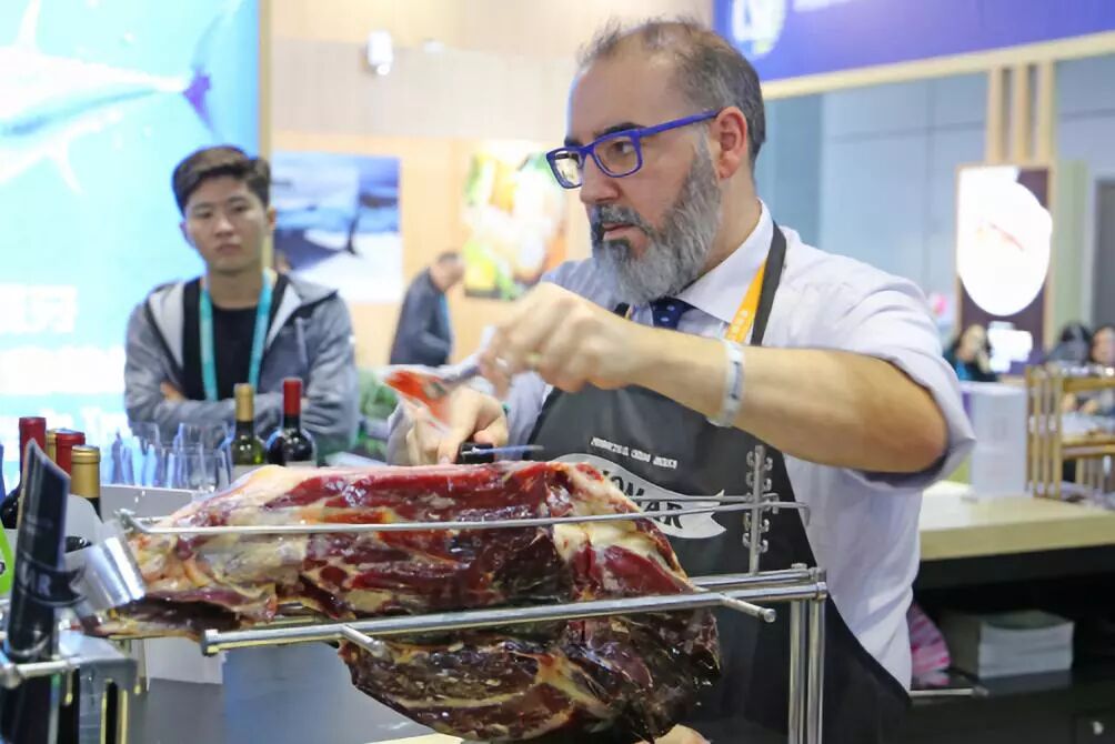 正在为前来参观的观众切火腿