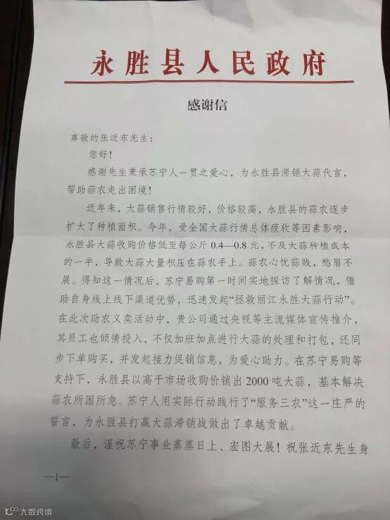 图:永胜县政府寄给苏宁控股集团董事长张近东的感谢信